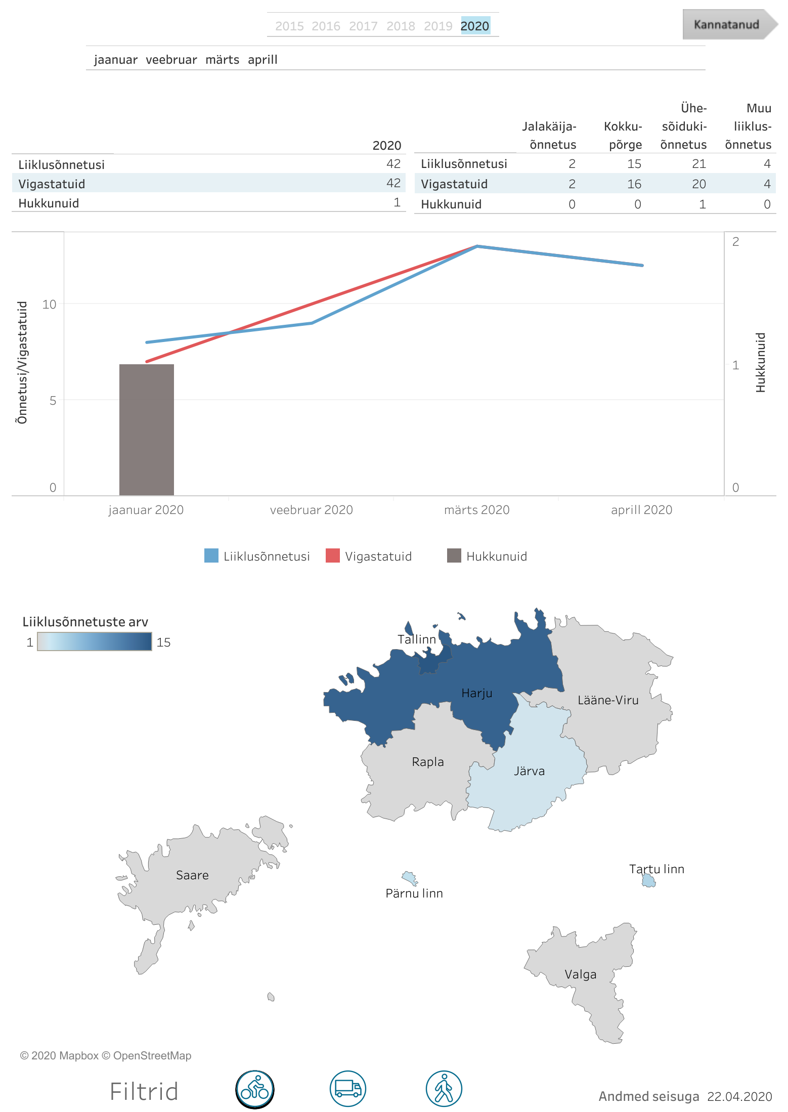 Maanteeameti liiklusõnnetuste statistikast selgub, et jaanuarist aprillini on juhtunud lausa 42 inimkannatanuga avariid, milles osales jalgrattur. Ühesõidukiõnnetustes sai viga 20 ja hukkus 1 rattur. 2019. aastal oli sarnaseid avariisid 25.