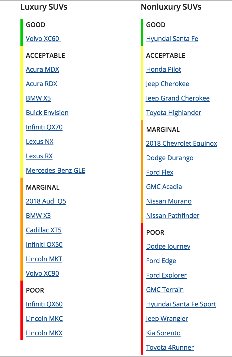 IIHS testitud autodest 11 tulemus oli “nõrk”, tosinal “marginaalne” ja tosinal “enam-vähem” ehk “rahuldav”. Teiste seas tunnistati nõrkadeks tegijateks nooblid maasturilaadsed Infiniti QX60, Lincoln MKC ja Lincoln MKX.